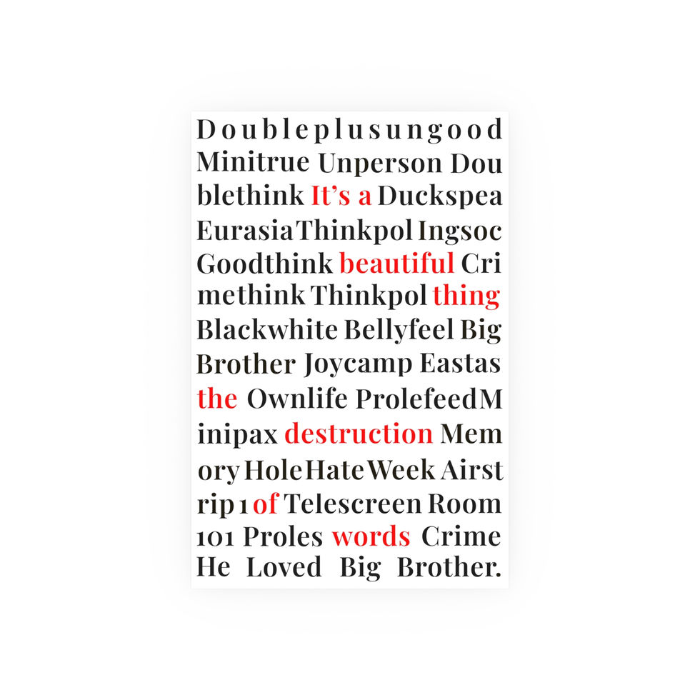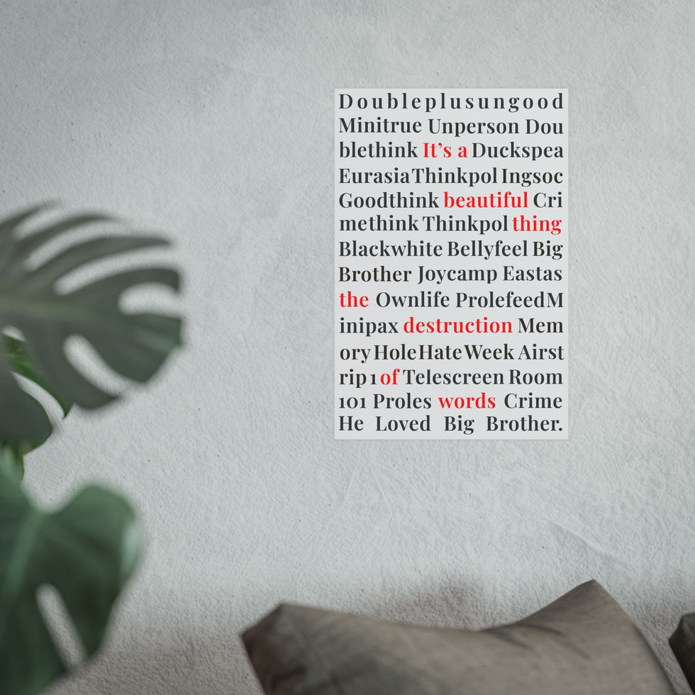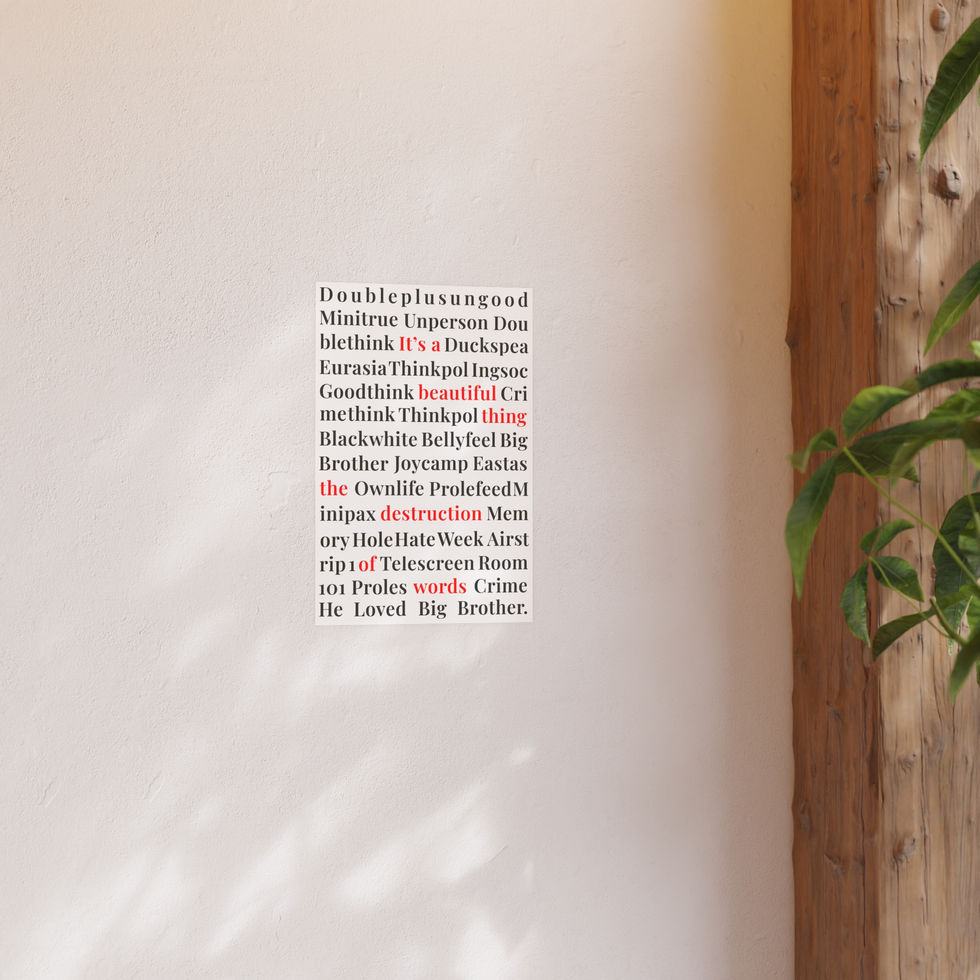 A typographic exploration of Newspeak from 1984, George Orwell’s chilling vision of language as a tool of control. Words collapse, meanings distort, and truth is reshaped by authority. This stark, text-driven poster is designed for readers who understand that language is never neutral—and never safe in the wrong hands.
