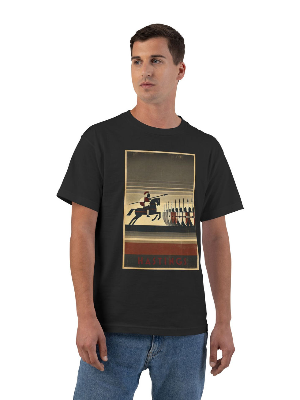 Commemorate one of the most pivotal moments in English history with this vintage-style Battle of Hastings t-shirt. A Norman cavalry charge meets the English shield wall in this bold and geometric design. History meets style in a wearable homage to 1066.