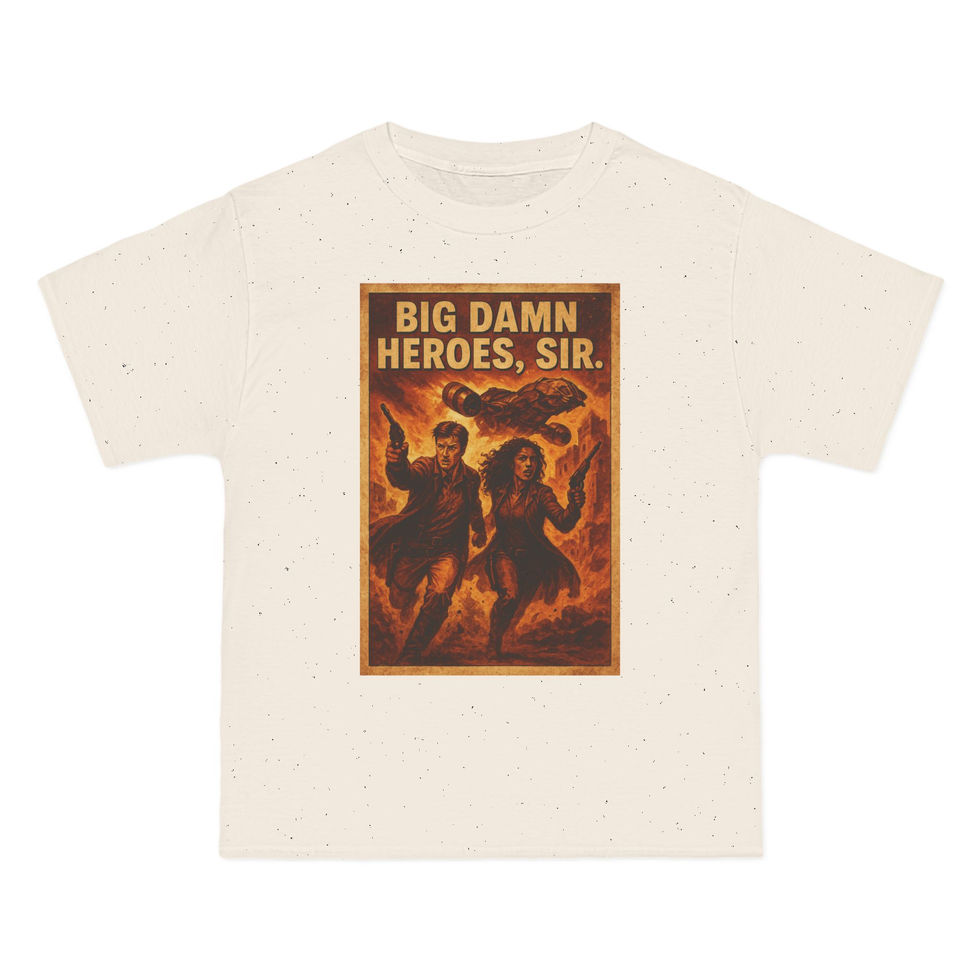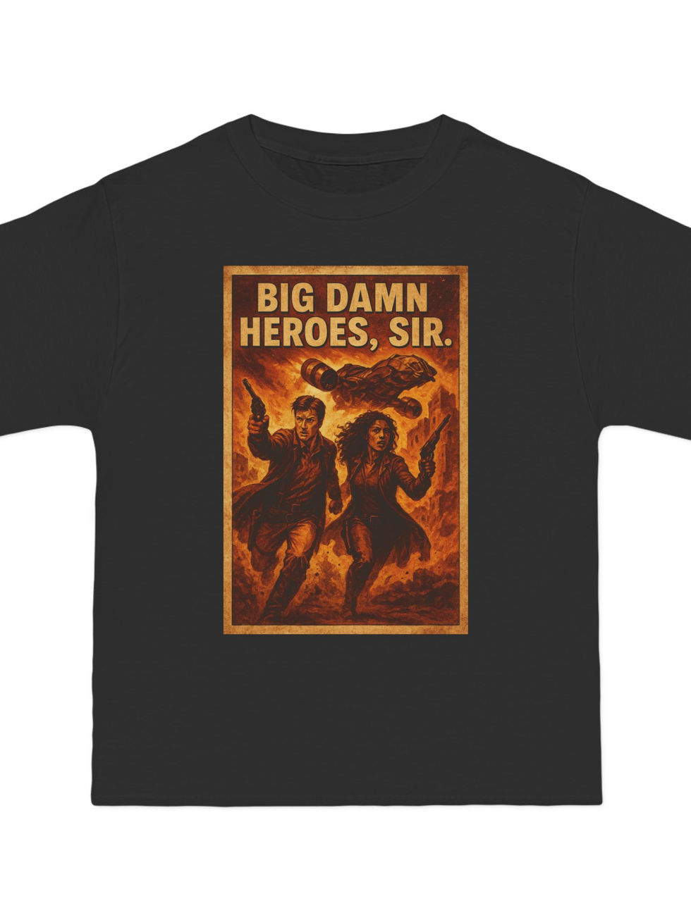 “Big damn heroes, sir.” This bold, action-packed Firefly tee captures Mal and Zoe mid-rescue, guns blazing and ship roaring behind. Designed in a distressed pulp poster style with fiery tones, it’s a tribute to loyalty, rebellion, and kicking ass in style. Essential for any Browncoat.