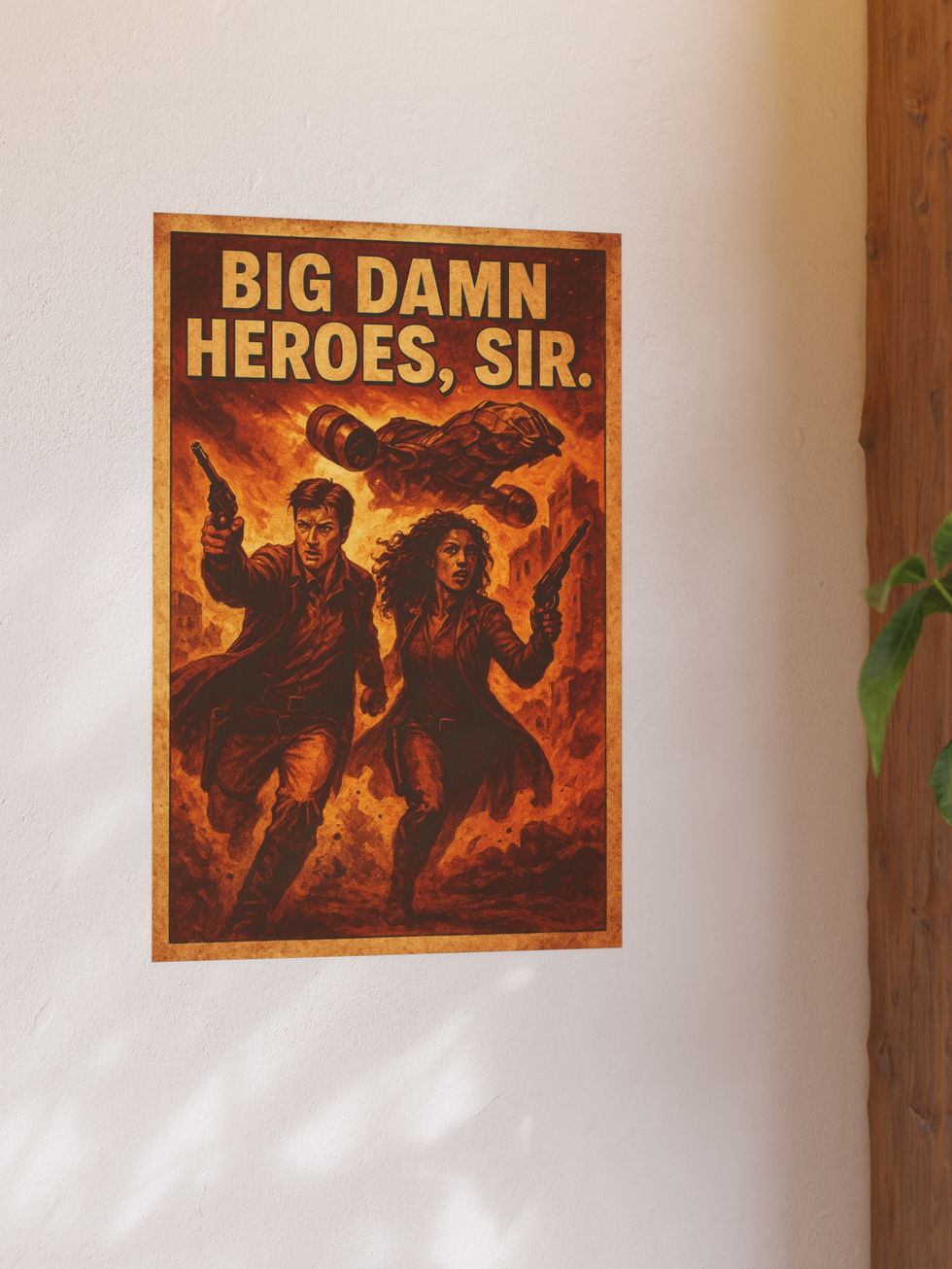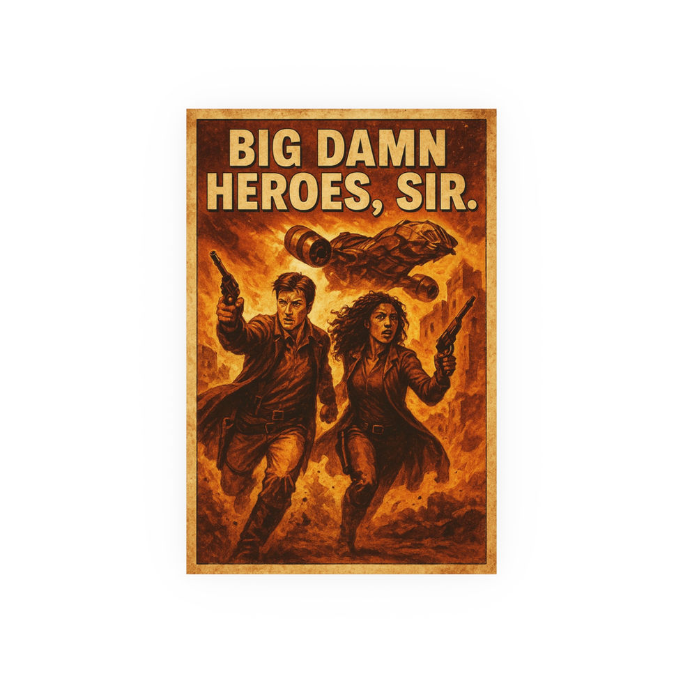 Inspired by Firefly and classic pulp adventure art, Big Damn Heroes blends vintage poster grit with modern cinematic drama. The result is loud, defiant, and unapologetically fun—exactly how a space western should feel.