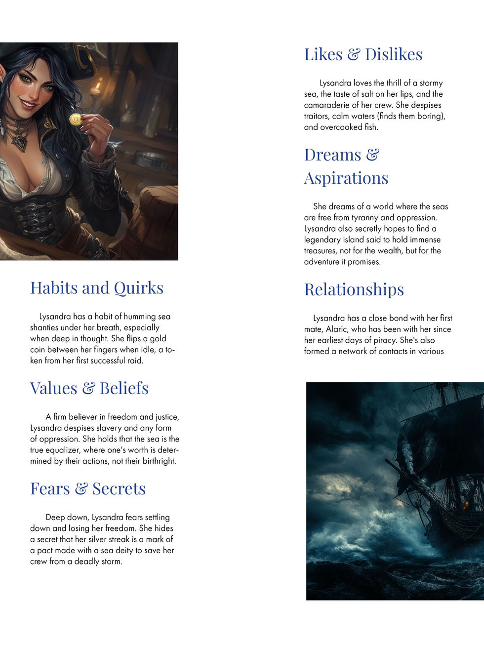 Whether your party sails the open seas or merely crosses paths with a dangerous legend, Lysandra brings instant depth, drama, and story momentum to your table.