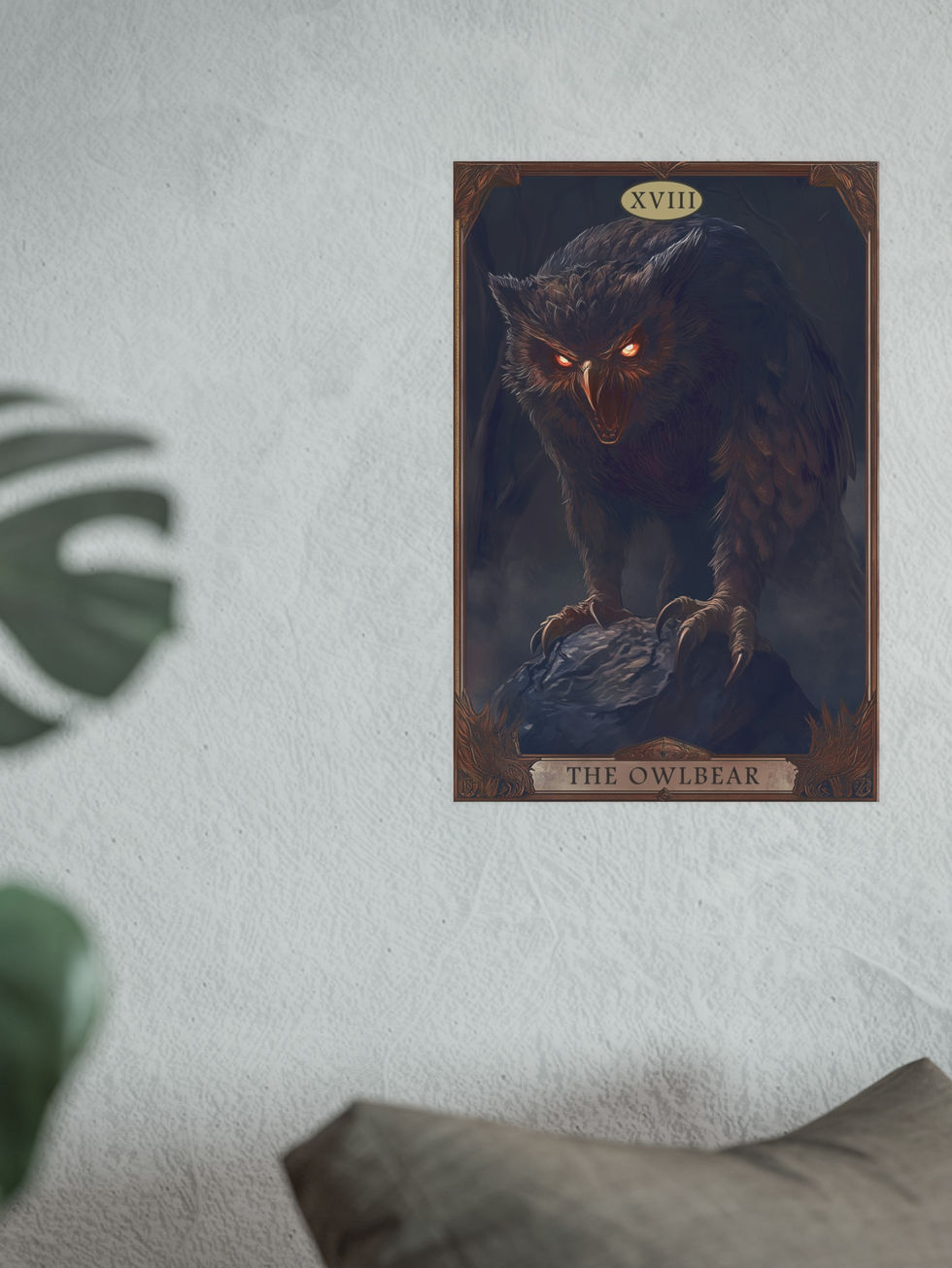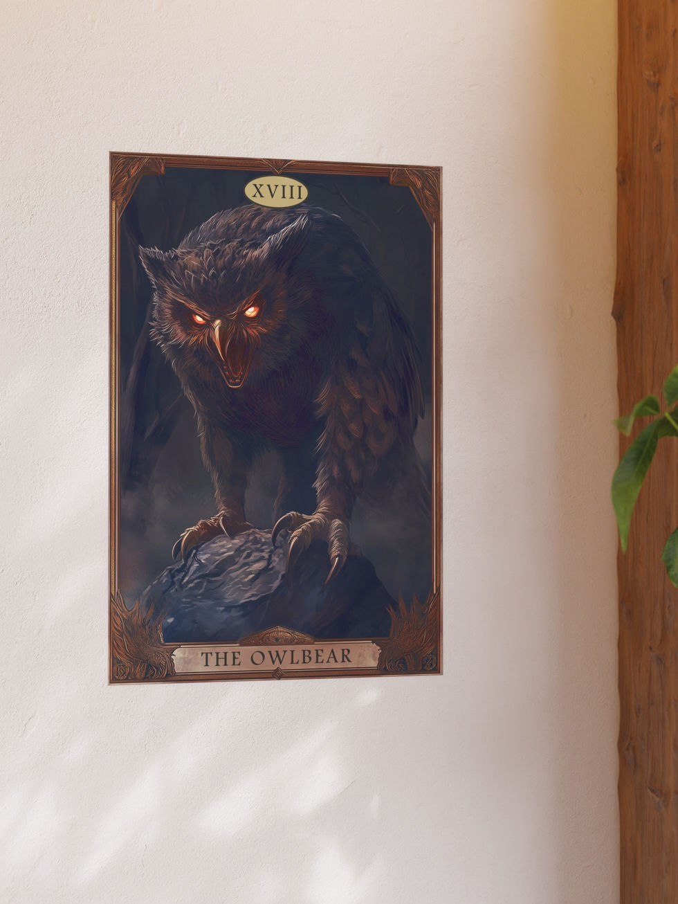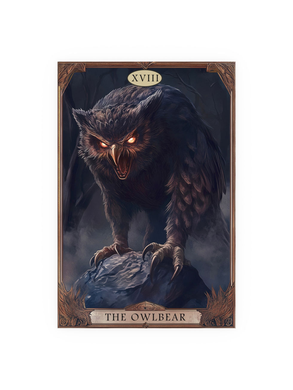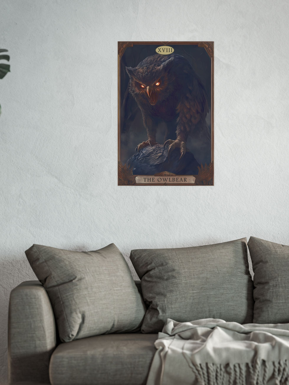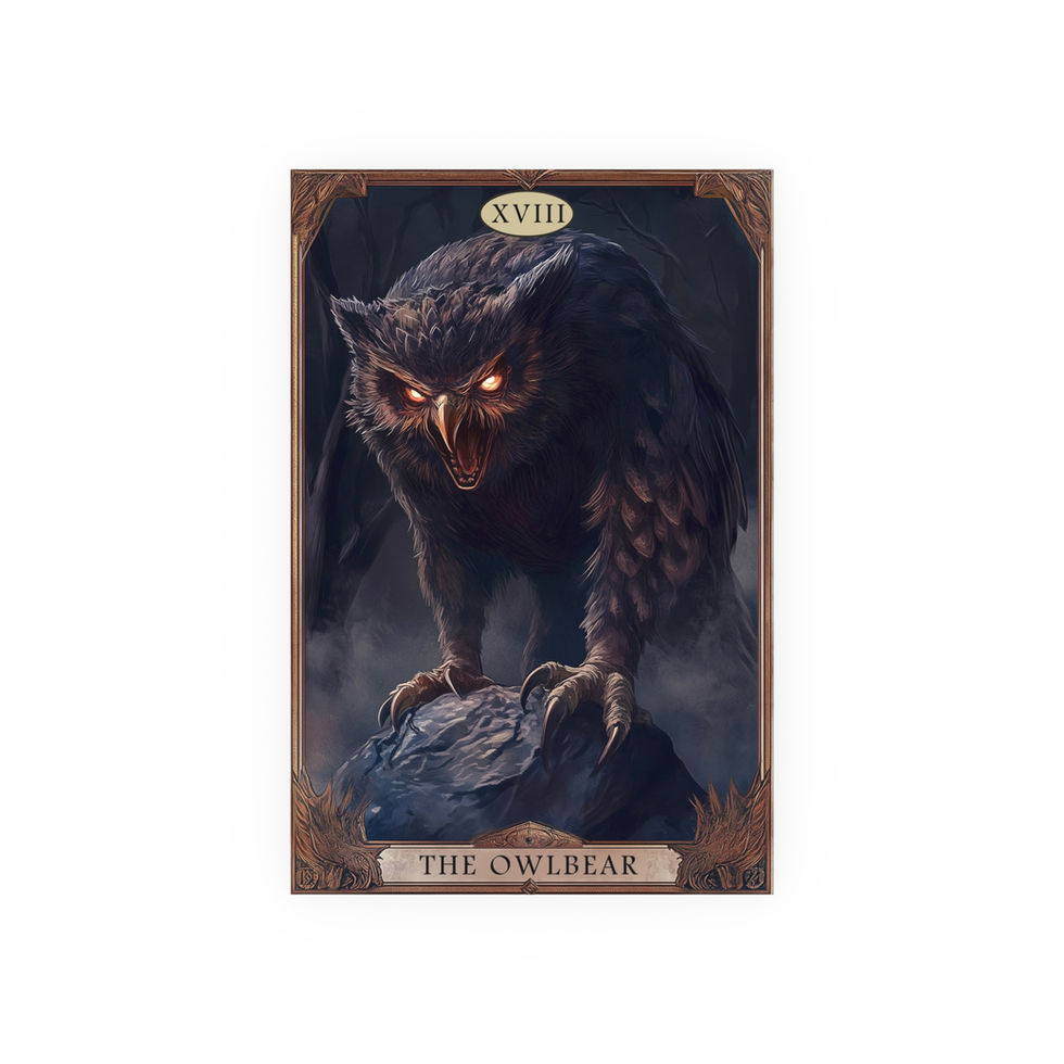 Channel primal fury with this dramatic tarot-style depiction of the legendary Dungeons & Dragons Owlbear. Set in a shadowy forest with glowing eyes and razor talons, this fierce creature emerges in full gothic splendor. A striking gift for D&D players, monster lovers, or collectors of dark fantasy artwork.