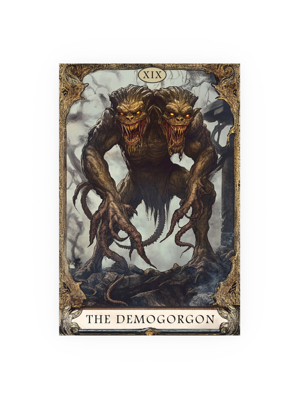 Unleash eldritch chaos with this tarot-style portrait of the Demogorgon, the two-headed Prince of Demons from Dungeons & Dragons lore. A monstrous icon from the abyss, rendered in spine-chilling detail. Ideal for D&D collectors, horror fantasy fans, and dark art enthusiasts.