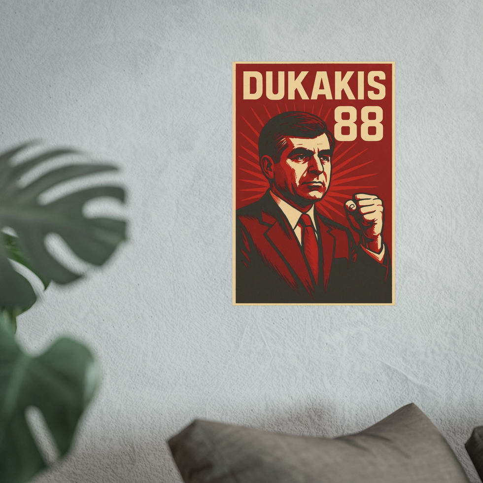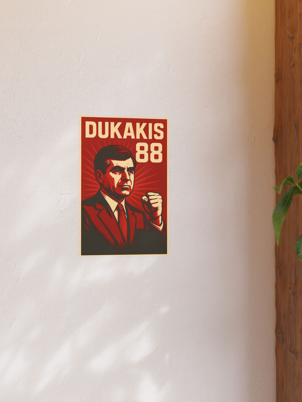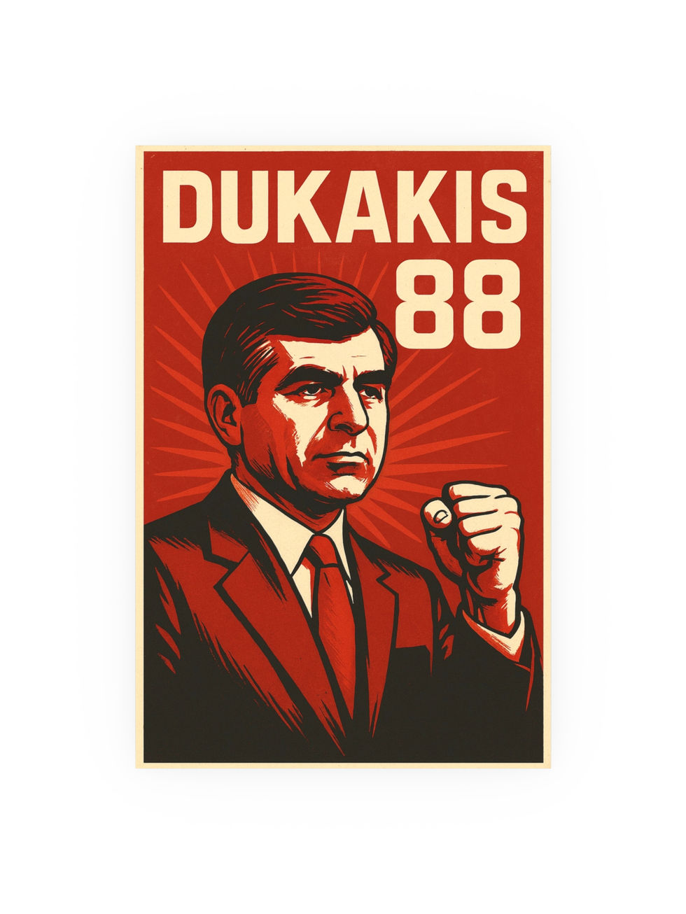 Power stance. Raised fist. The fiery spirit of a man who was this close. This bold red-and-beige campaign poster captures Michael Dukakis in his full 1988 glory -stylized like a Cold War-era motivational print, but infused with pure Massachusetts energy.