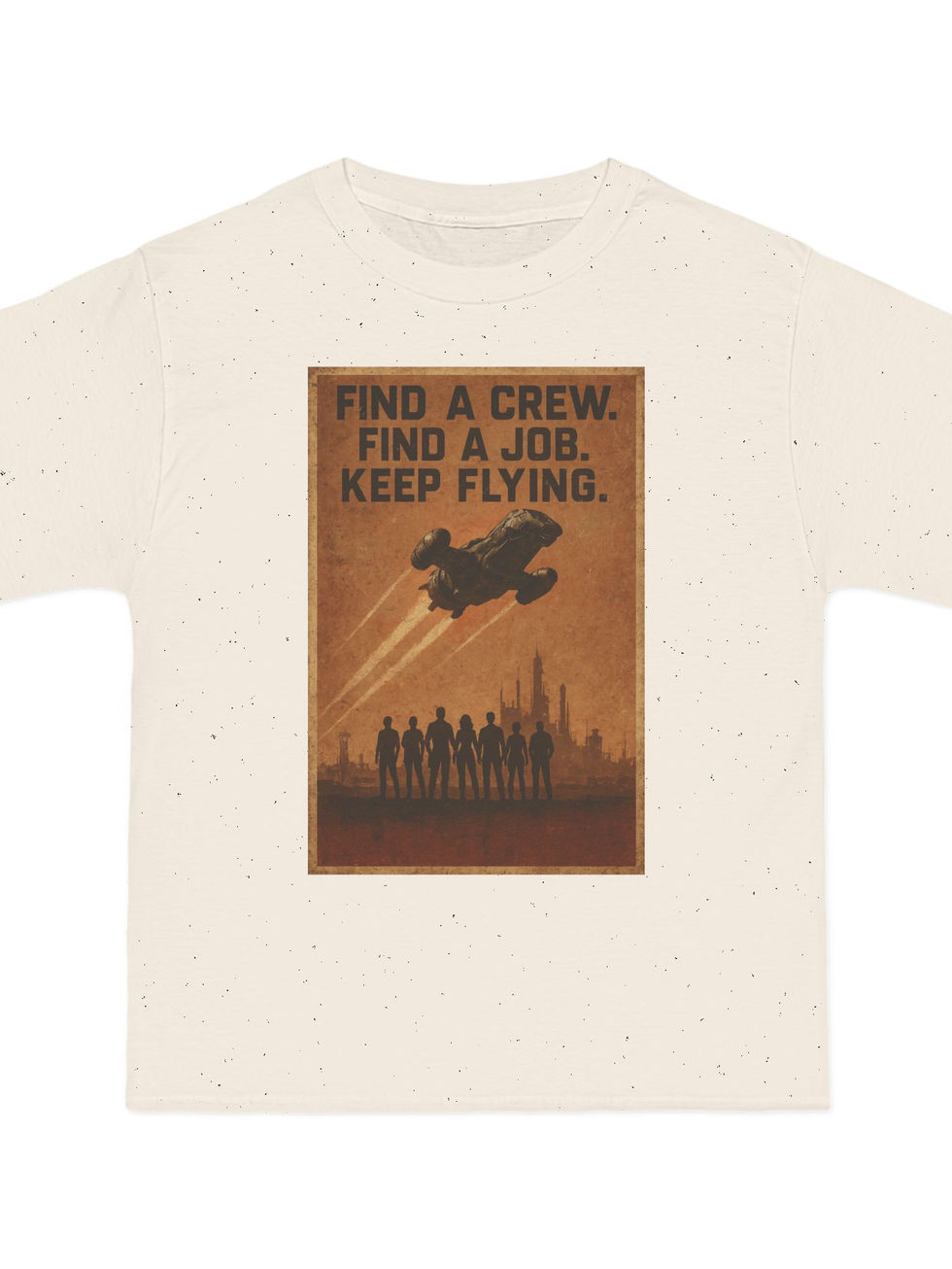 Keep flying with this vintage-style Firefly T-shirt featuring the iconic Serenity crew silhouetted beneath their ship. Gritty, weathered textures meet bold typography in a design that speaks to loyalty, survival, and freedom among the stars. Perfect for Browncoats, sci-fi fans, and rebels with a cause.