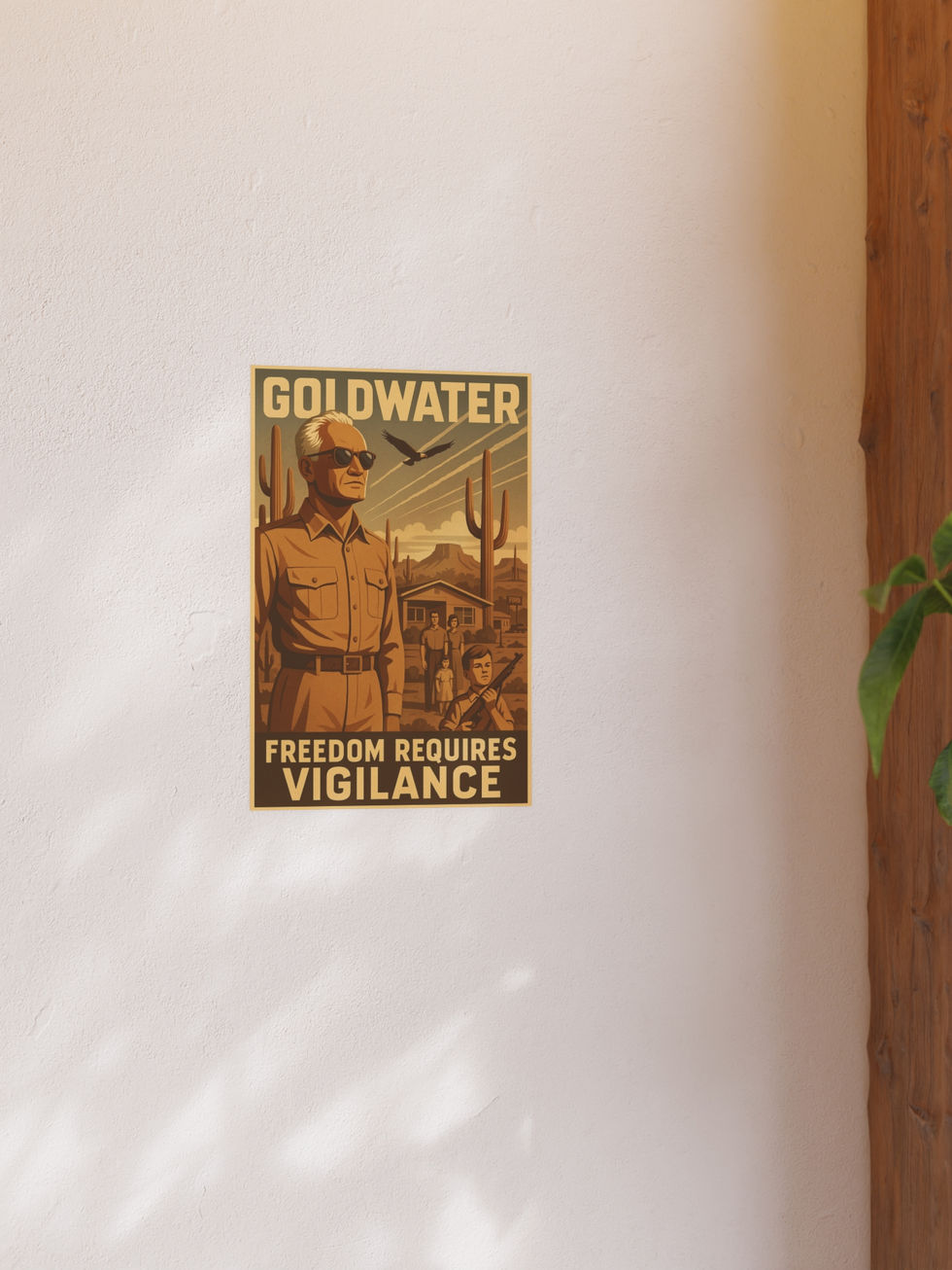 Arizona sun, Cold War shadows. This vintage-style poster depicts Barry Goldwater standing tall and stony, surrounded by saguaros, jet trails, and the stern gaze of midcentury American resolve. With a child cradling a rifle and a Ford sign looming in the distance, it’s a rugged paean to liberty, desert patriotism, and the latent tension of freedom itself. Perfect for fans of retro political art, ironic Americana, and Arizona dads who never quite left '64.