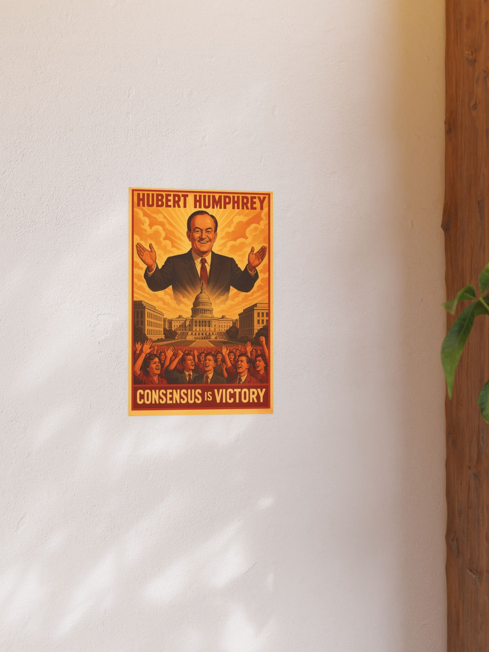 Celebrate the spirit of bipartisanship with this vintage-inspired Hubert H. Humphrey propaganda-style poster. Featuring the "Happy Warrior" himself glowing over the U.S. Capitol, this print reimagines consensus politics as a triumph of the people—complete with thunderous applause and just a touch of tongue-in-cheek. Ideal for political history buffs, Cold War design lovers, or anyone who thinks compromise is still sexy.