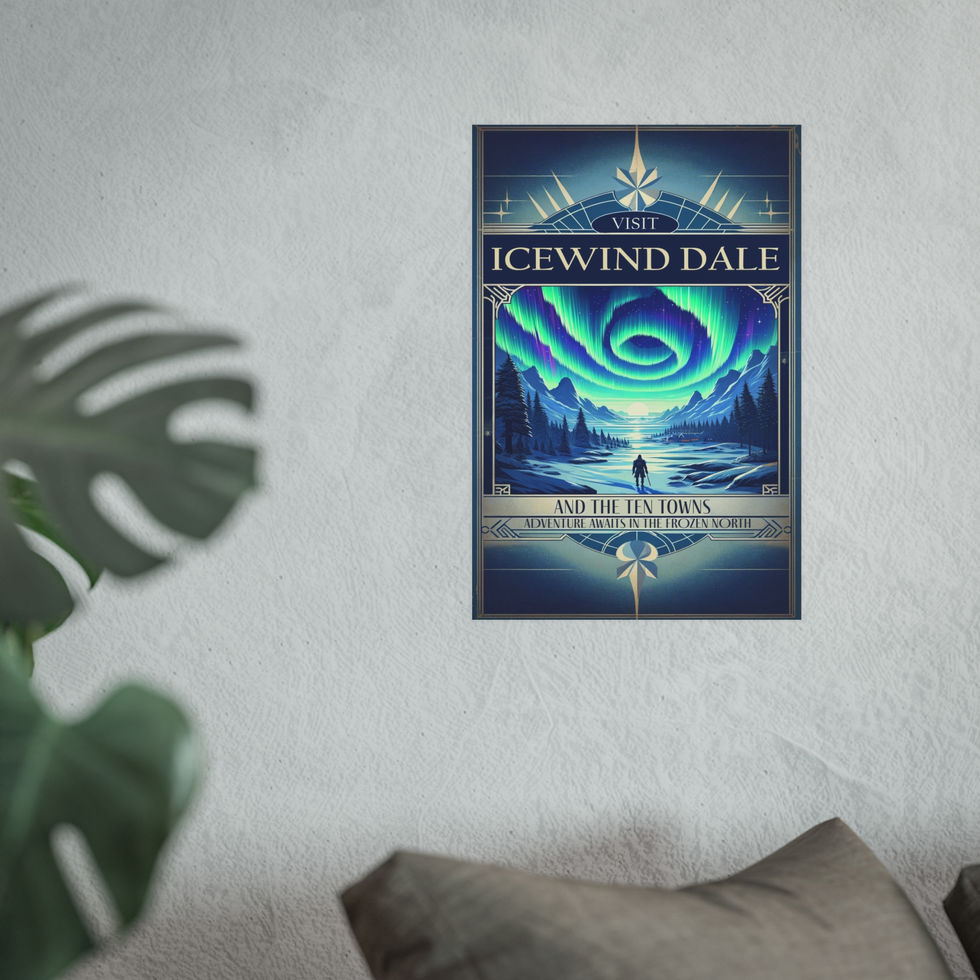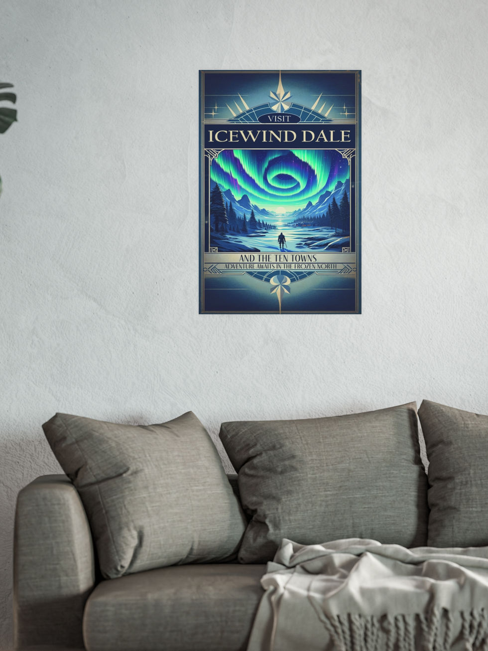 Step into a wind-swept, lantern-lit world with this vintage Art Deco travel poster inspired by Icewind Dale. Warm brass tones and bold geometric lines meet frosted blues to evoke frozen passes, distant lighthouses of ice, and the hush before dawn. Hang it where maps and memories mingle — above your gaming table, in a reading nook, or beside a shelf of well-worn modules — and let it pull you back into that crisp, adventurous night.