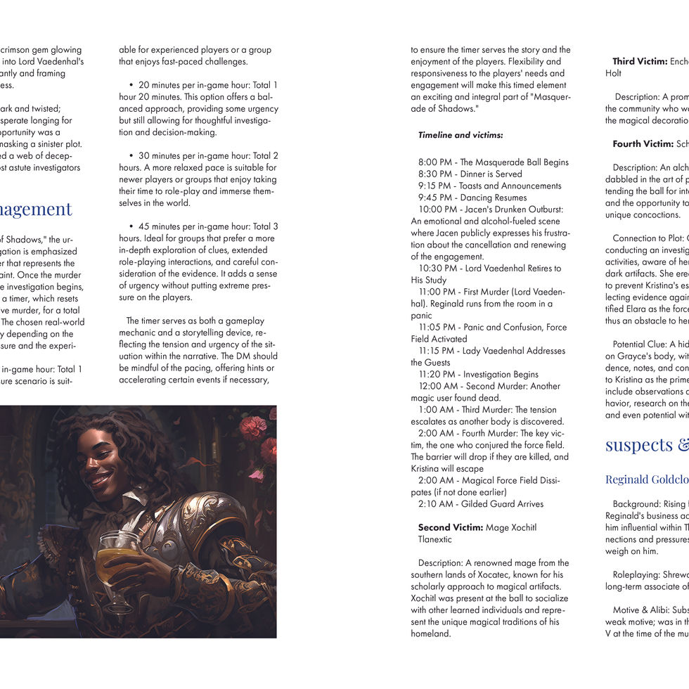 Delve into a soiree of masks and mysteries, where the line between friend and foe is obscured by allure and deception. When the chimes of jubilation turn to gasps of horror, and a crime most heinous unveils, the guests and even the heroes find themselves ensnared in a web of deceit and danger.