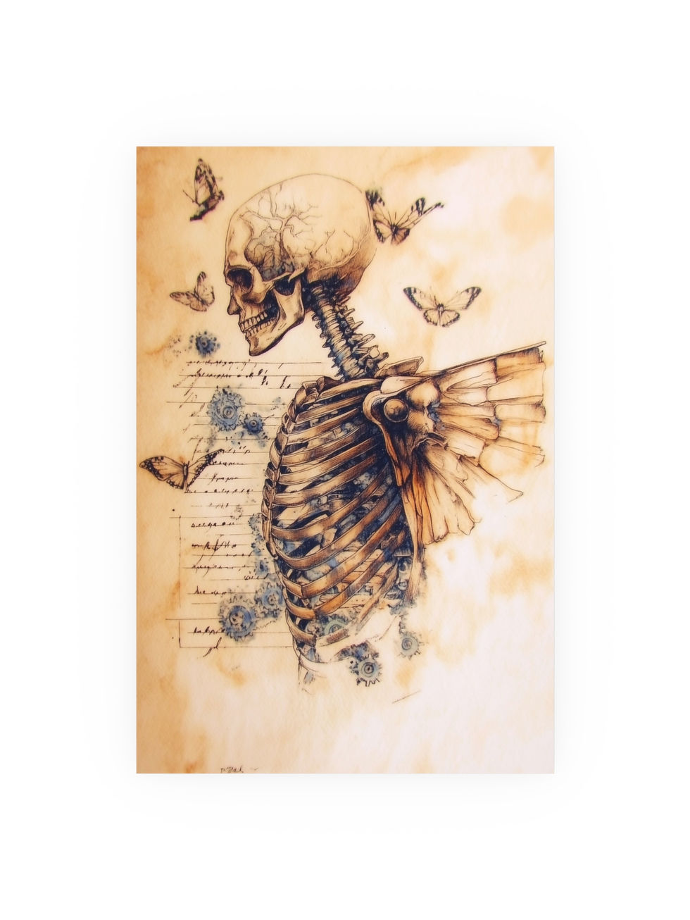 An ethereal fusion of anatomy, mechanics, and transformation — this steampunk art print features a skeletal figure adorned with mechanical wings and surrounded by delicate butterflies. Cogs and gears blend seamlessly into the ribcage, while handwritten script flows behind the figure like a forgotten blueprint of the soul.