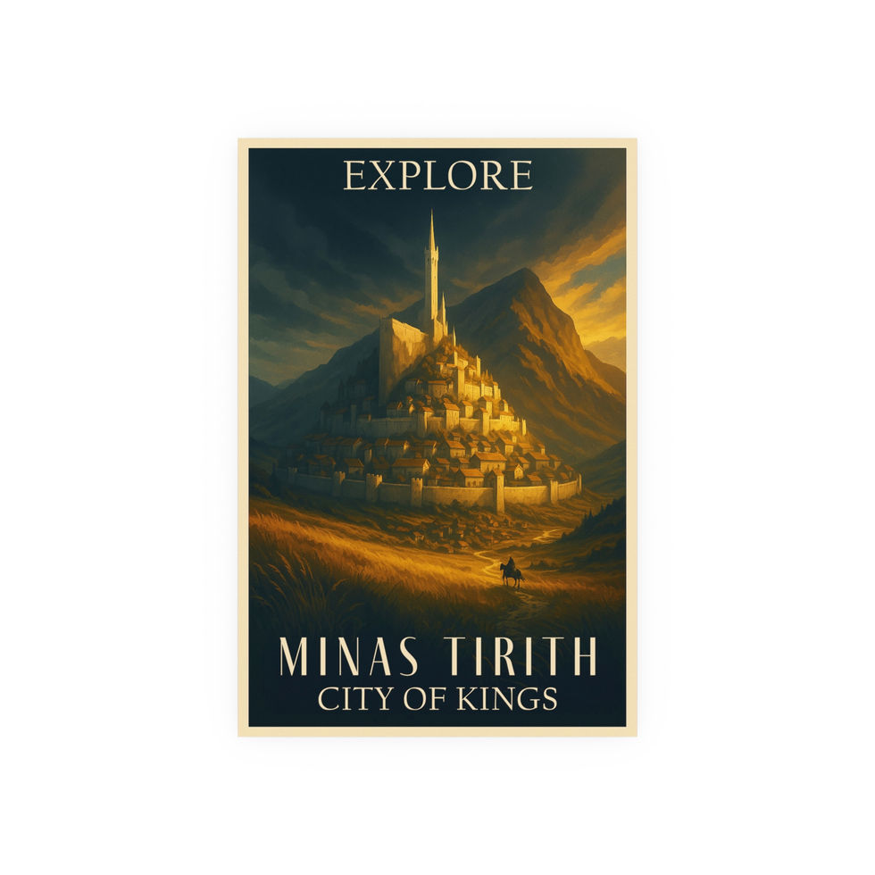 Behold the White City in all its layered majesty. This Art Deco travel poster depicts Minas Tirith rising from the mountainside, illuminated by the last golden light of the day. The stacked rings of the city glow with quiet resilience, while a lone rider approaches along a winding road — a small figure heading toward something monumental.