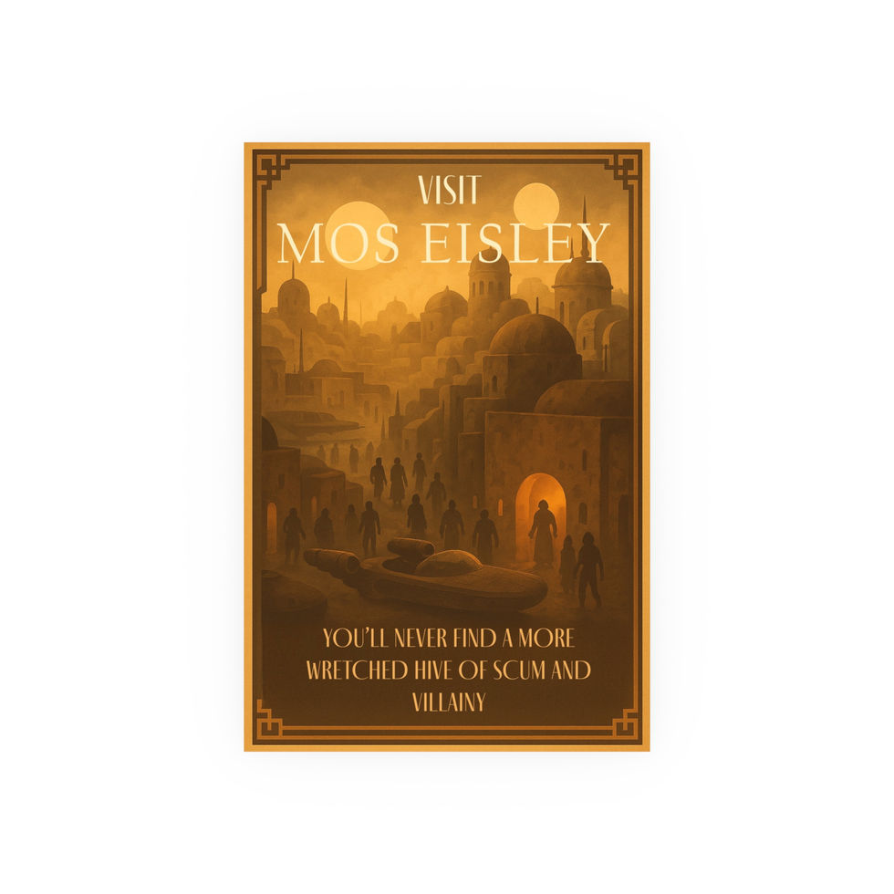 Step onto the sun-blasted streets of Tatooine’s most infamous port with this Art Deco–inspired Mos Eisley travel poster. Warm, dusty ambers and deep silhouettes conjure that unmistakable air of danger and opportunity — a place where smugglers, wanderers, and wide-eyed travelers cross paths under twin suns. The composition leans on layered domes, drifting crowds, and a lone landspeeder carving a path through the haze, building a world that feels equal parts mythic and lived-in.