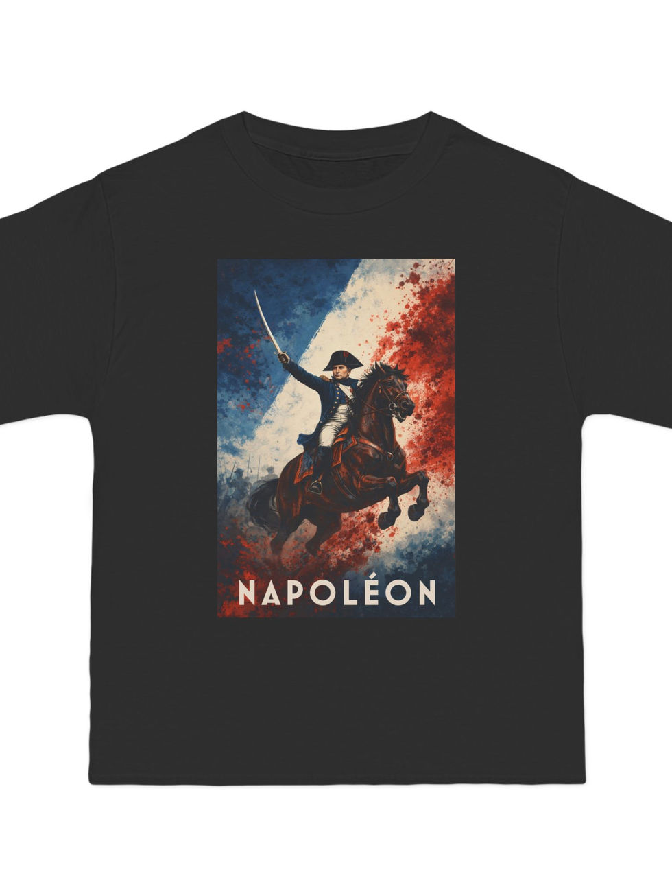 Make a bold statement with this dynamic Napoleon T-shirt, showcasing the Emperor himself charging into battle with saber raised. Backed by a stylized French flag, this shirt combines historical gravitas with modern graphic design — ideal for Francophiles, armchair generals, and history students alike.