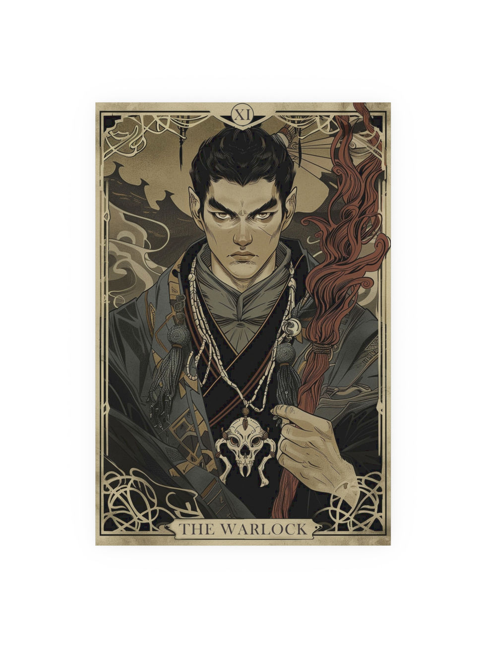 Delve into the dark arts with The Warlock, an intricately detailed Art Nouveau portrait of a spellcaster bound by eldritch power. Adorned with talismans, bone charms, and an aura of mystery, this character channels forbidden pacts and shadowy lore. Perfect for fans of occult fantasy, RPG warlocks, and gothic mysticism.
