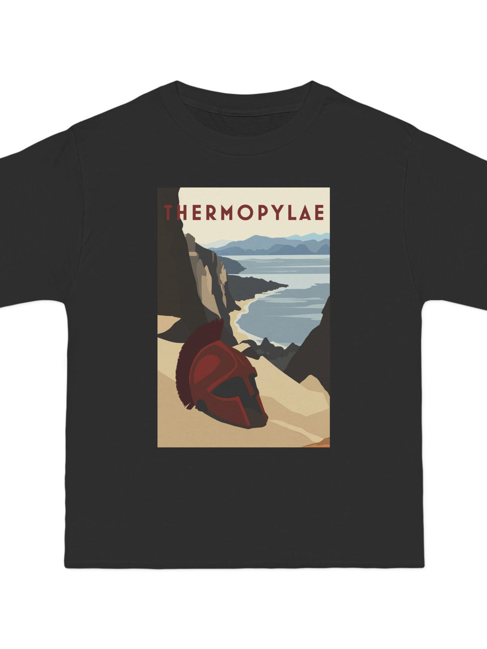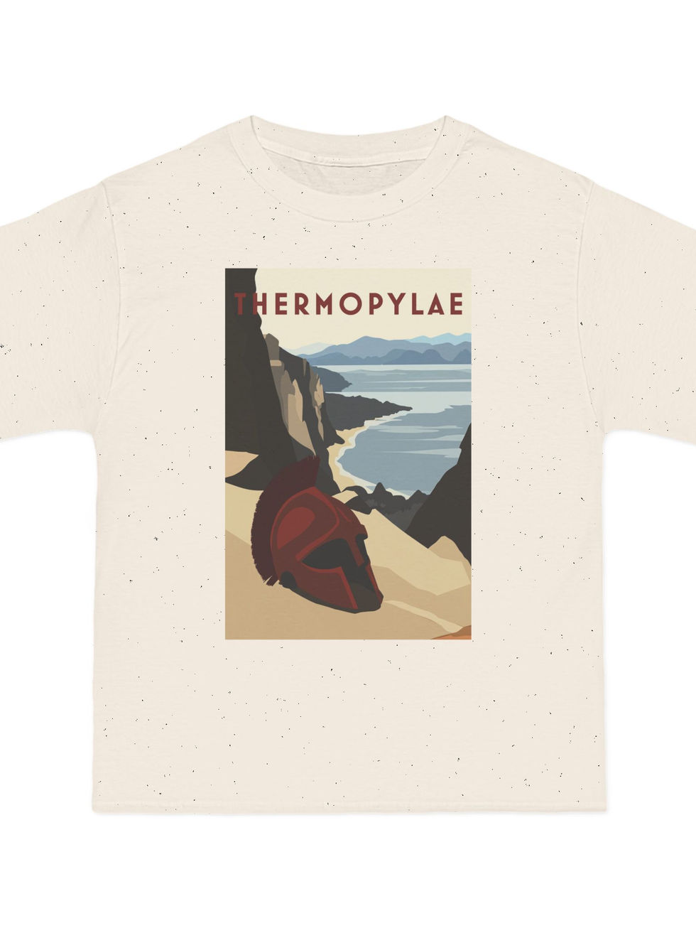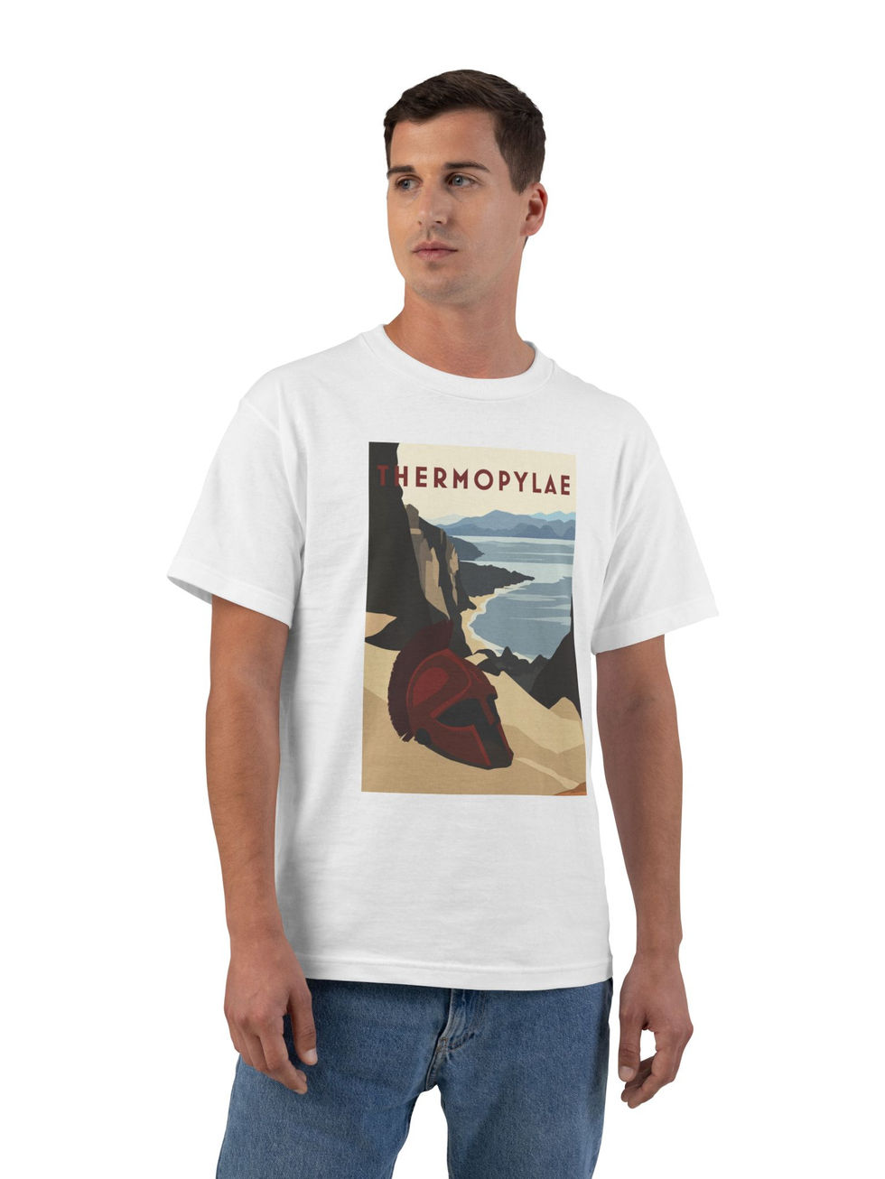 Honor the legendary last stand of the 300 with this minimalist Thermopylae t-shirt. Featuring a Spartan helmet lying silent on a windswept mountain pass, this design captures both the serenity and gravity of ancient heroism. Inspired by mid-century travel posters, it's perfect for lovers of history, strategy, and timeless aesthetics.