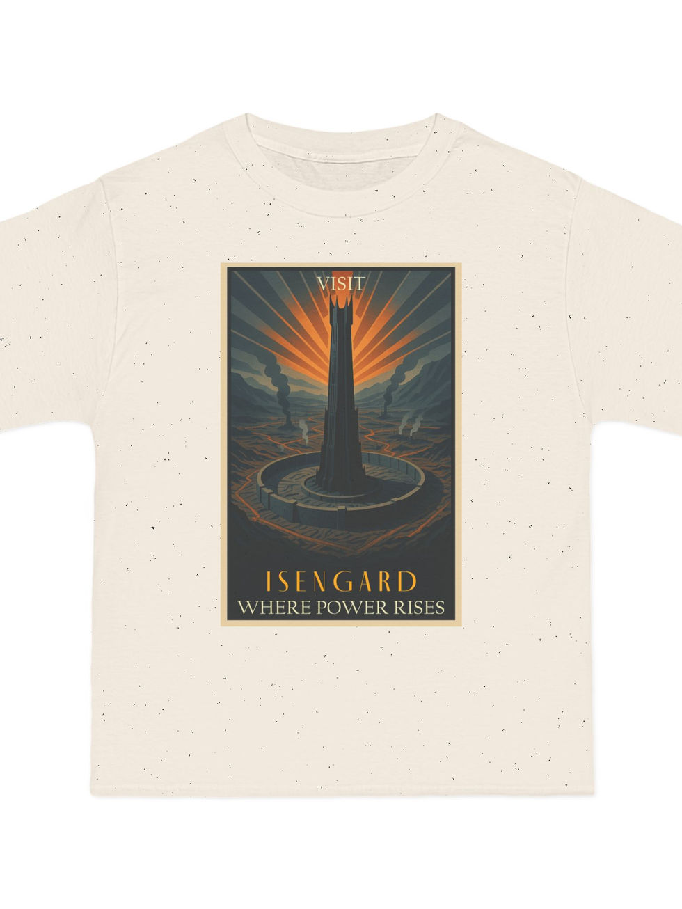 Towering above the industrial sprawl of the White Hand, Orthanc stands black and proud. This poster-style tee captures Isengard mid-conversion — a once-peaceful refuge now humming with forges and ambition. Saruman approves.