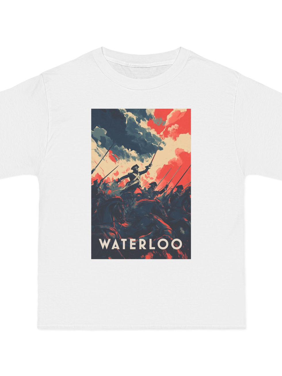 Celebrate (or mourn) the epic clash at Waterloo with this stylized T-shirt, capturing the swirling drama of Napoleon’s last stand. This design brings the stormy skies and saber-clashing chaos of 1815 to life in a bold, graphic style. A must-have for students of the Napoleonic Wars.